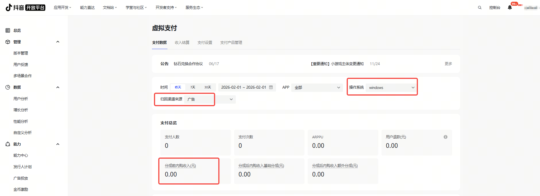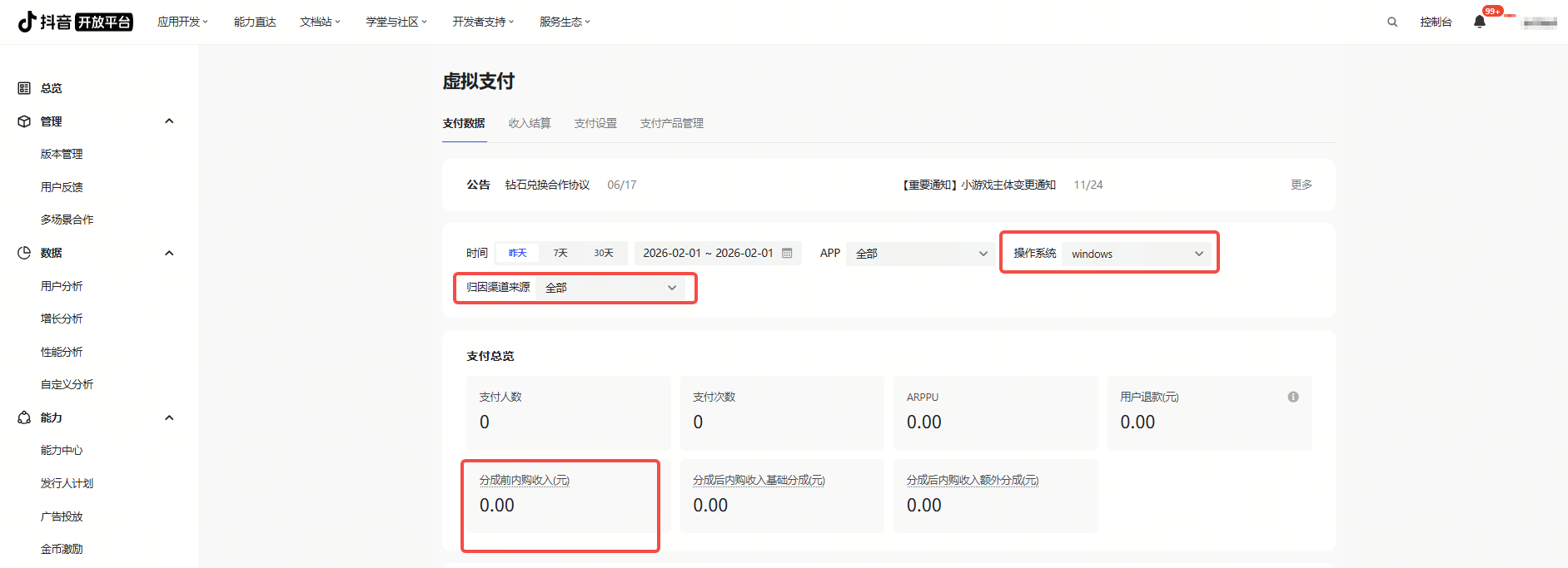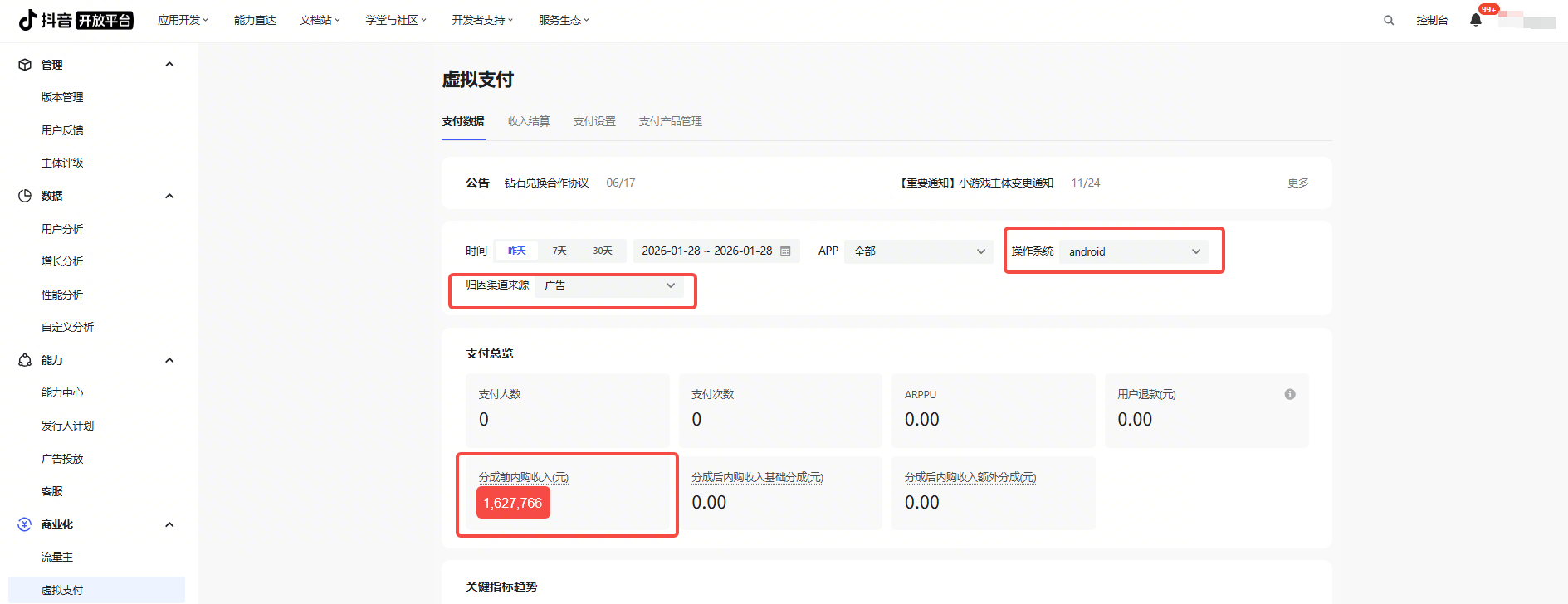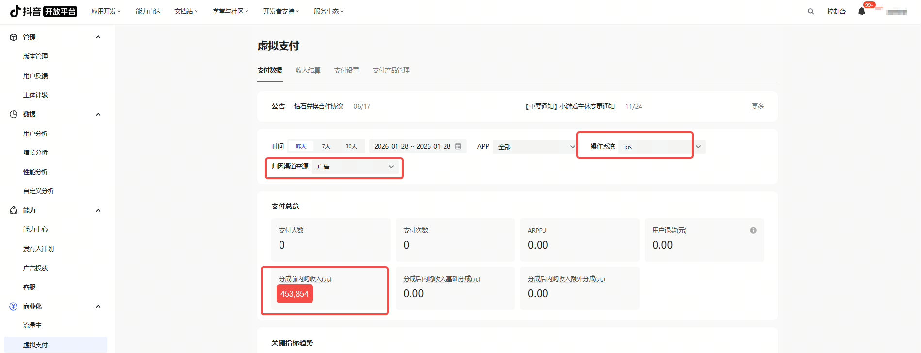 点击对应小游戏的【商业化-虚拟支付-支付数据】。筛选条件中选择对应周期,按照右图3红框位置,记录【分成前内购收入】(包含windows设备下所有的普通支付、钻石支付、担保支付充值流水)