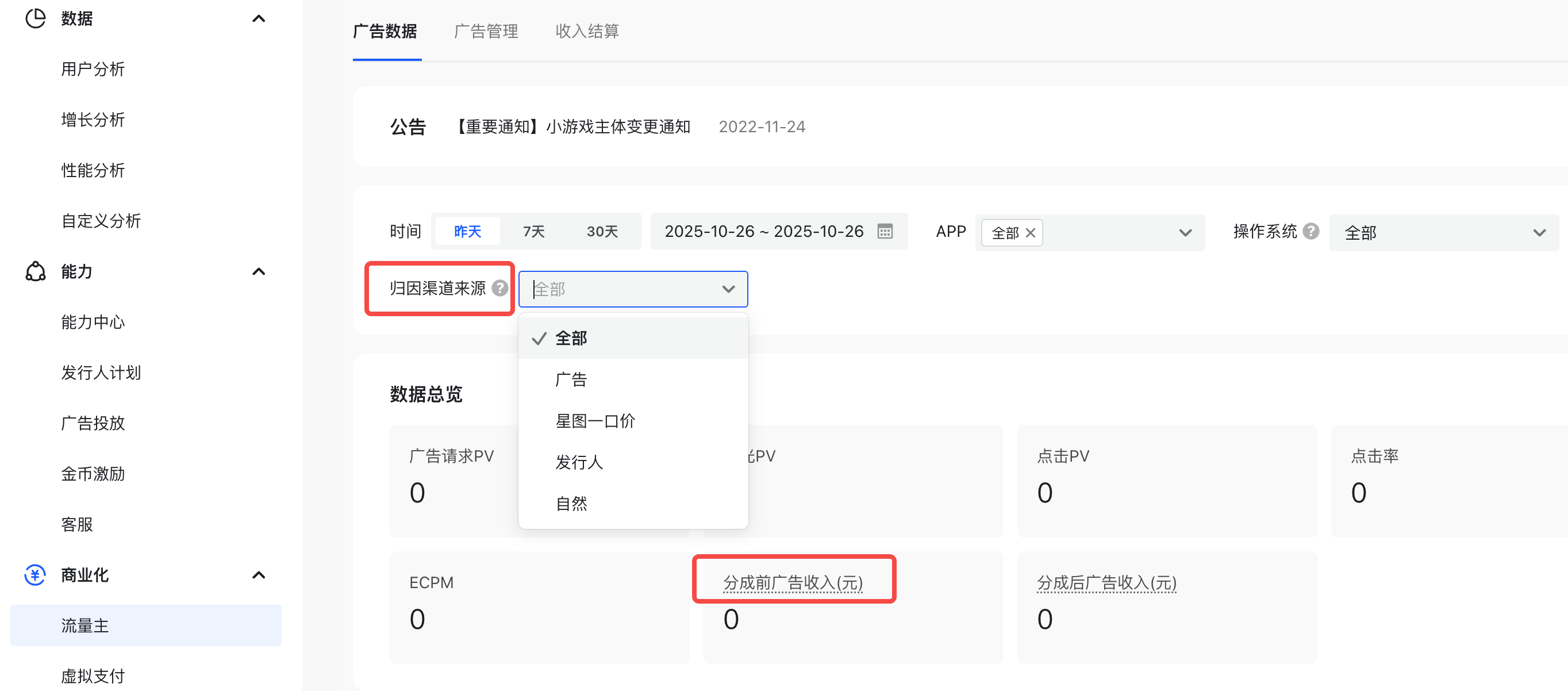 - ◦广告分成前收入:前往「抖音开放平台」-「商业化」- 「流量主」-「广告数据」页面,选择归因渠道来源为「发行人任务」与「星图一口价」可查看对应的分成前广告变现收入。