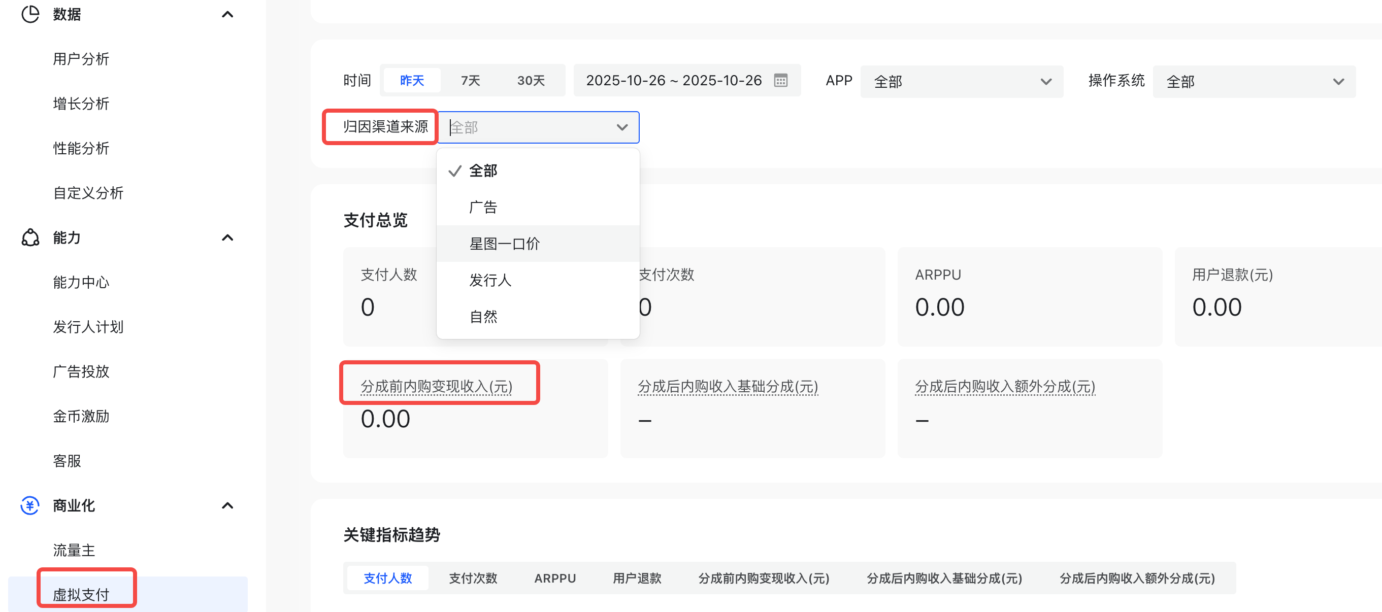 - ◦内购分成前收入:前往「抖音开放平台」-「商业化」-「虚拟支付」-「支付数据」页面,选择归因渠道来源为「发行人任务」与「星图一口价」可查看对应的分成前内购变现收入。