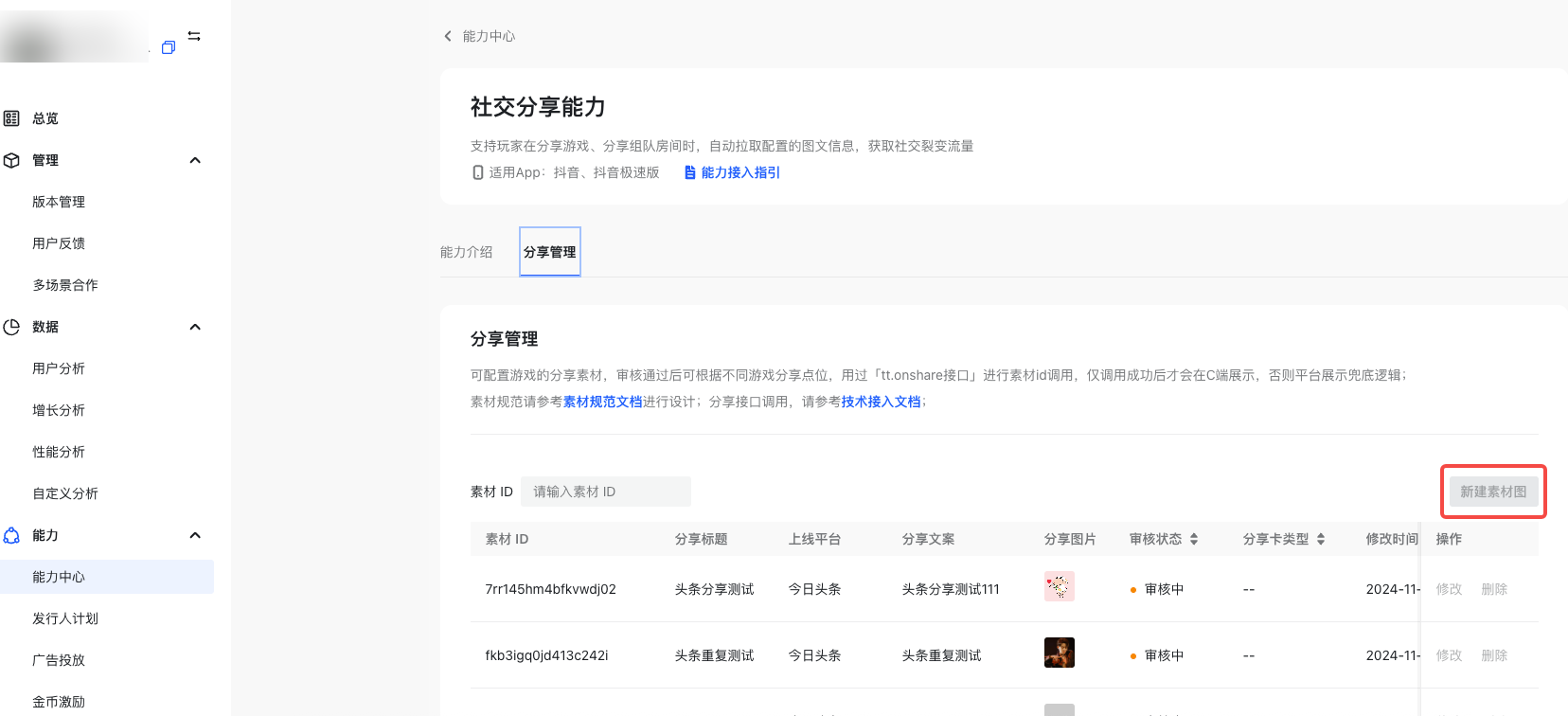 开发者可以提前通过开发者后台配置分享图片、标题、文案,并由平台进行审核。审核通过的素材会生成对应的 templateId,给到开发者调用。