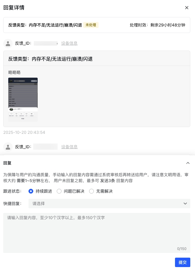 - •针对每条反馈,平台支持对其进行筛选、导出、回复、管理等操作。