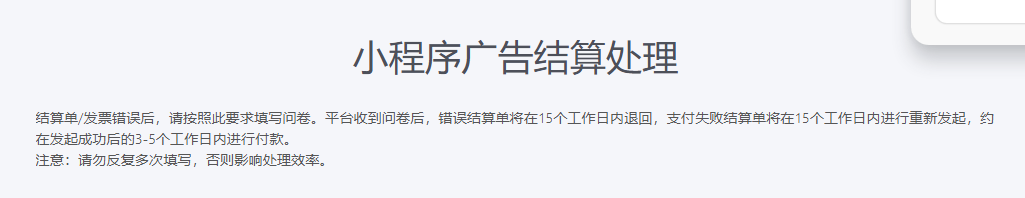 4、如何正确填写问卷 场景1:多个小程序,一个主体,多个结算单付款失败。 只需要填写一份问卷即可。 场景2:特殊场景。出现主体变更,有多个结算账户。不同结算单对应的结算账户不一样,可以在备注里补充结算单编号。 | 问卷地址:https://wj.toutiao.com/q/33665/B7Y0yl74/4e6f/#/ |