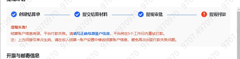 1、收到提现付款失败信息 | 1、提现付款报错。商业化变现-收入结算-提现记录-查看详情 2、站内信 |