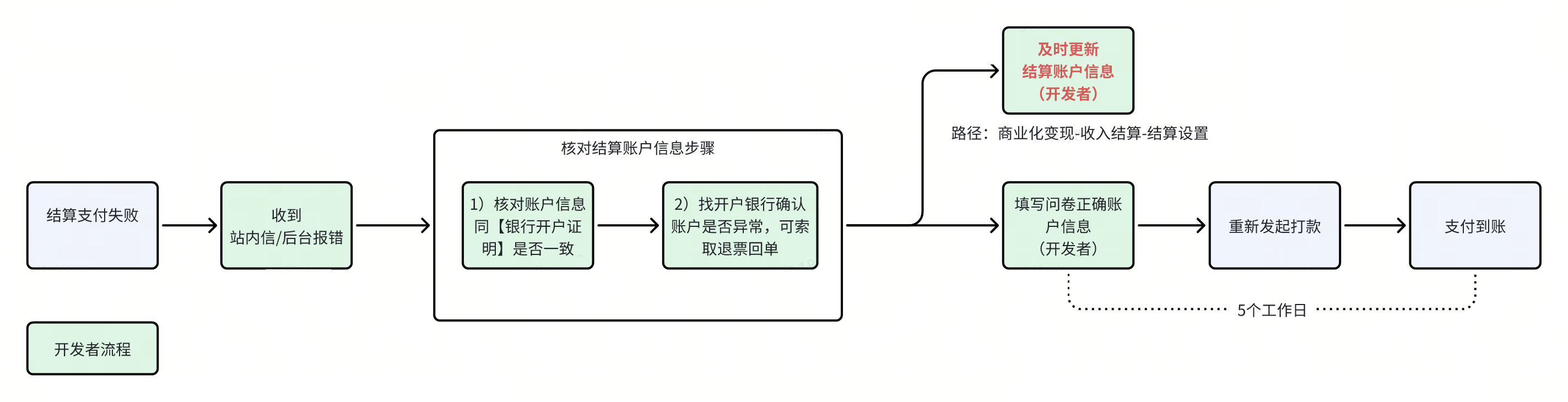 2、核对账户信息是否正确&存在异常 | 1)核对【银行开户证明】和结算设置中的结算账户信息是否完全一致。参考5.1前置准备 2)如果信息完全没问题,则打款失败由于账户异常导致。 解决方案:找开户行确认账户是否存在异常(冻结/中止/休眠/限额),可通过向银行索要退票单了解详细原因。 恢复后可通过问卷或者进线客服侧告知账户正常,平台将会按照原支付信息安排重新支付。 |
