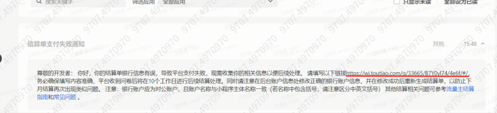 3、填写问卷 | 1、提现付款报错。商业化变现-收入结算-提现记录-查看详情 点击蓝色字体【请填写正确结算账户信息】打开问卷填写信息 2、站内信 点击链接打开问卷填写信息 |