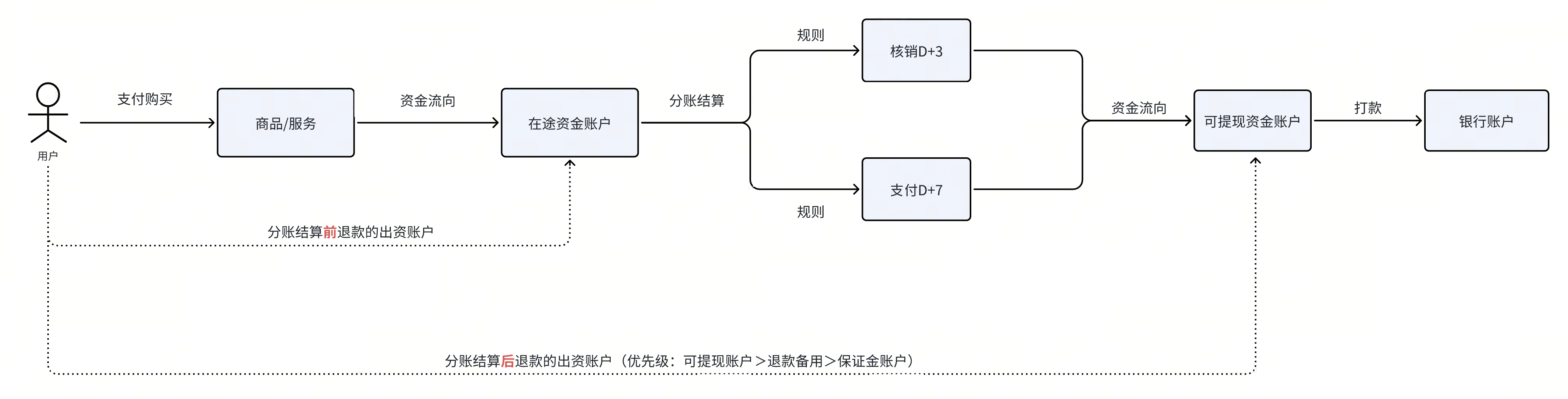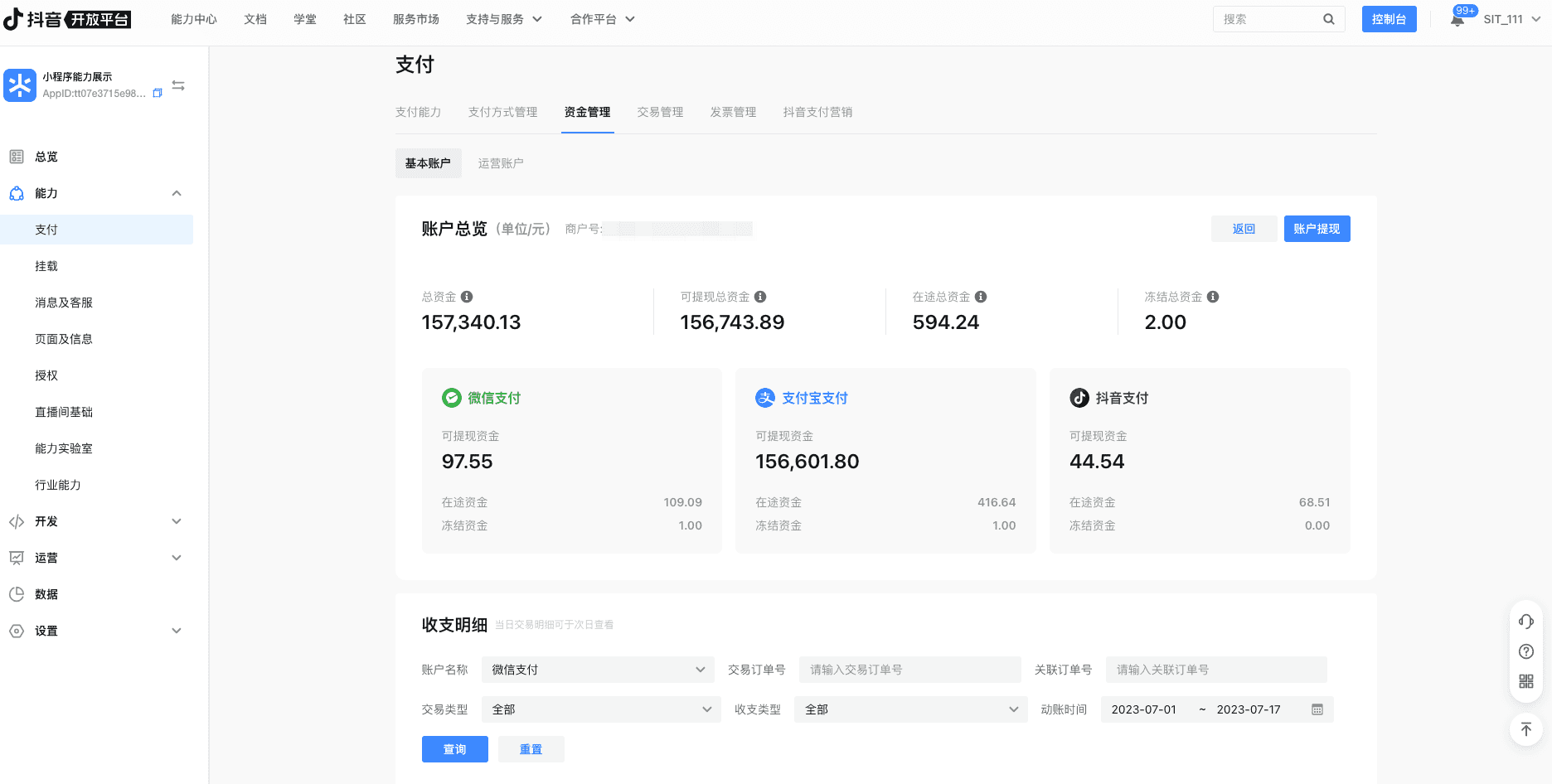 在途总资金 | 用户支付后金额进入到商户在途户中,商户发起分账/结算后资金才能从在途户结算到可提现资金。 | |