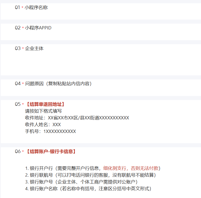 4、如何正确填写问卷 场景1:多个小程序,一个主体,多个结算单付款失败。 只需要填写一份问卷即可。 场景2:特殊场景。出现主体变更,有多个结算账户。不同结算单对应的结算账户不一样,可以在备注里补充结算单编号。 | |