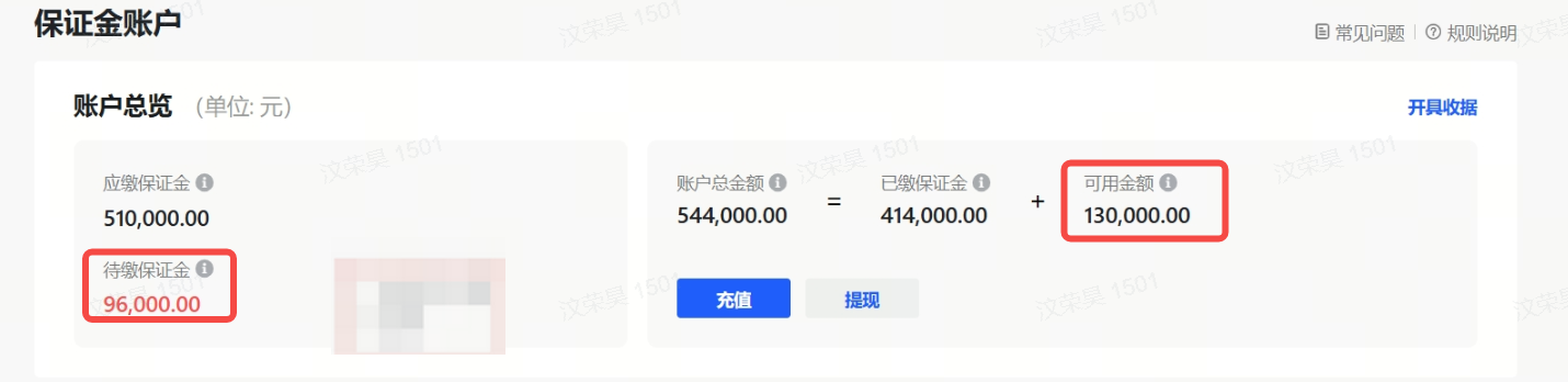 - 可用余额 :已缴纳保证金超出应缴纳的额度,可用余额支持提现