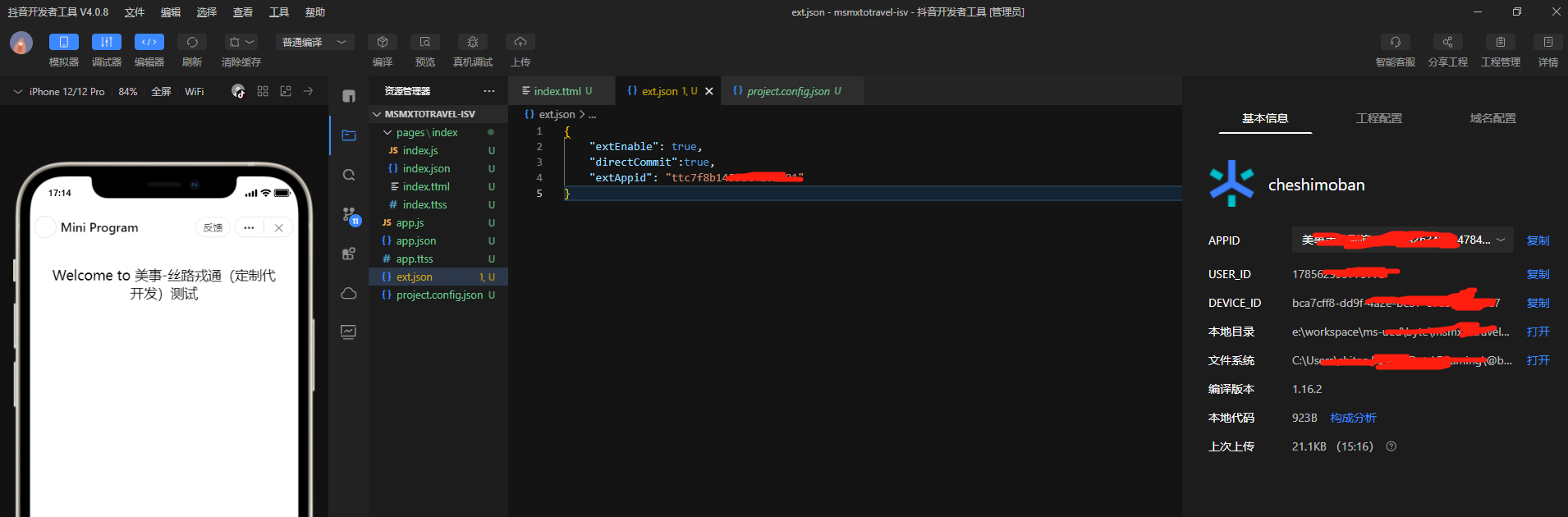 使用模板小程序的抖音开放平台账号登录 IDE,在 IDE 的【详情】页中,可以看到模板小程序绑定的第三方小程序名称以及当前模板小程序的 AppId,在定制代开发模式下,配置了 ext.json 文件且文件中配置了授权小程序的extAppid,但是详情页中不会有ext_appid授权小程序信息。