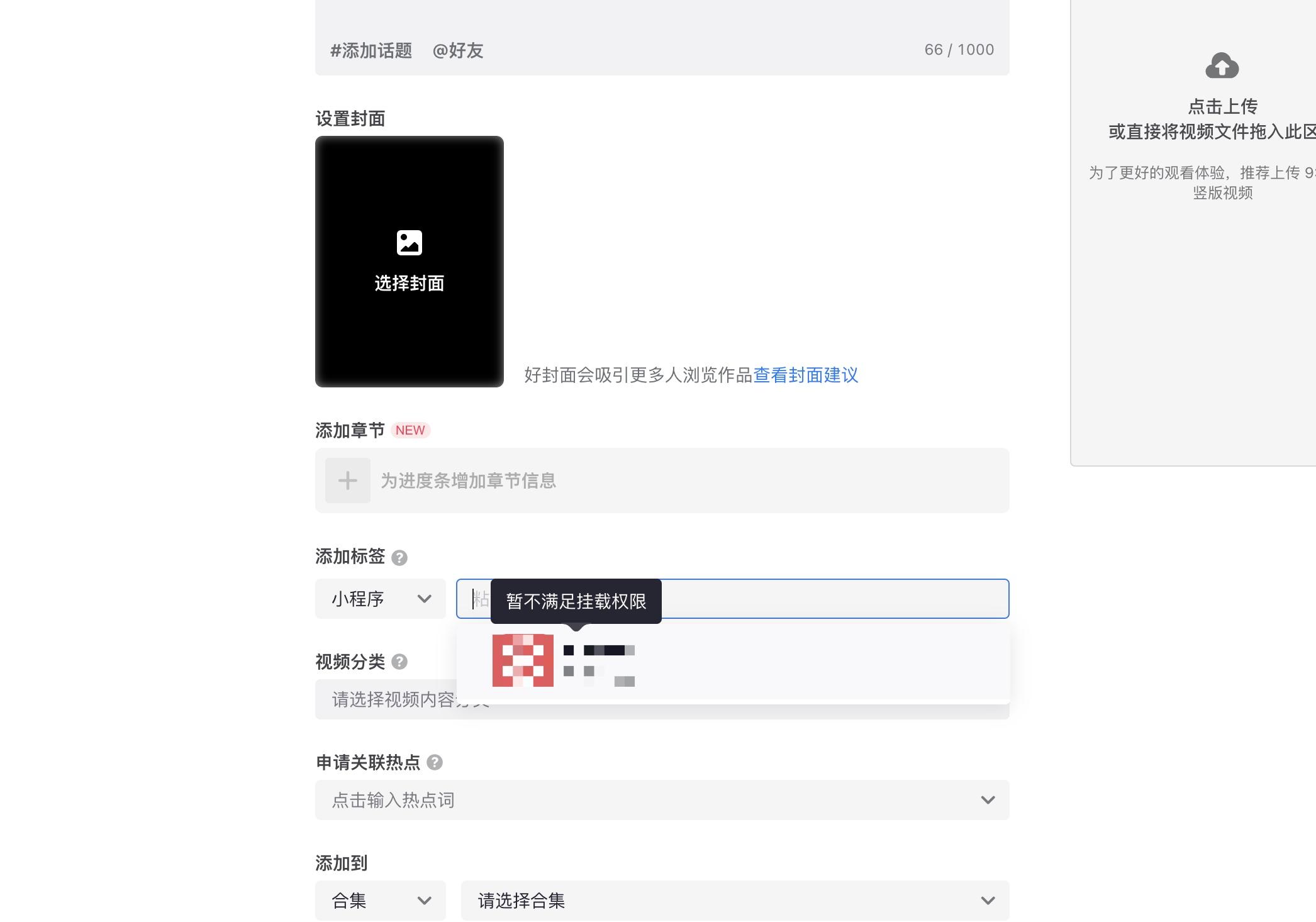您好,辛苦了。麻烦帮忙看下为什么抖音号无法添加小程序链接:我的小程序信用分100分,评级B级开发者后台截图可以看到,已经绑定抖音号抖音创作者后台截图在添加标签一栏,可以搜索到小程序,但是提示“暂不满足挂载权限”