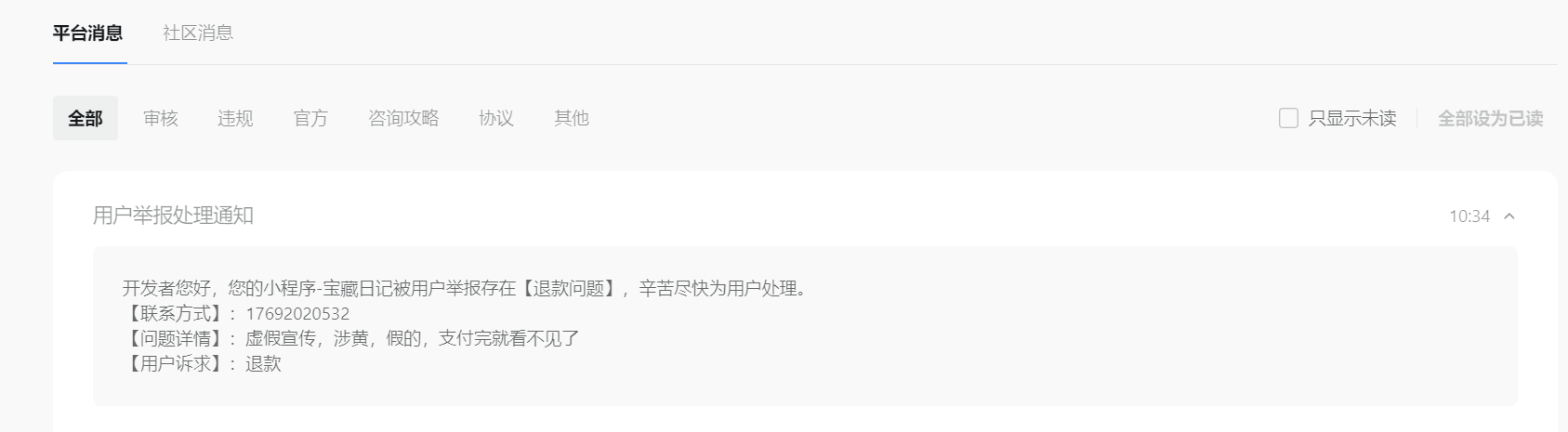 用户举报但在“反馈中心”无记录不知道在哪里处理。另外,用户连内容都没看见又怎会知道小程序涉黄?用户解锁后在底部会有获取内容的按钮,不存在说虚假和支付完就不见了,小程序设有客服,没见在客服反馈直接举办退款,这算不算恶意举报?