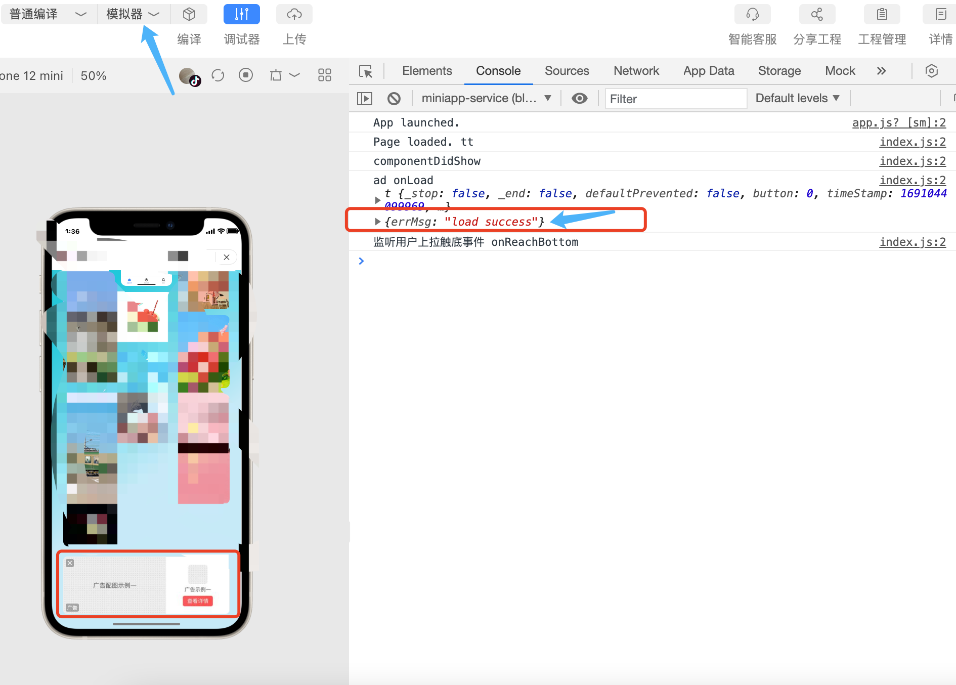 在开发者工具中调试时,提示已成功注入广告(信息流广告)