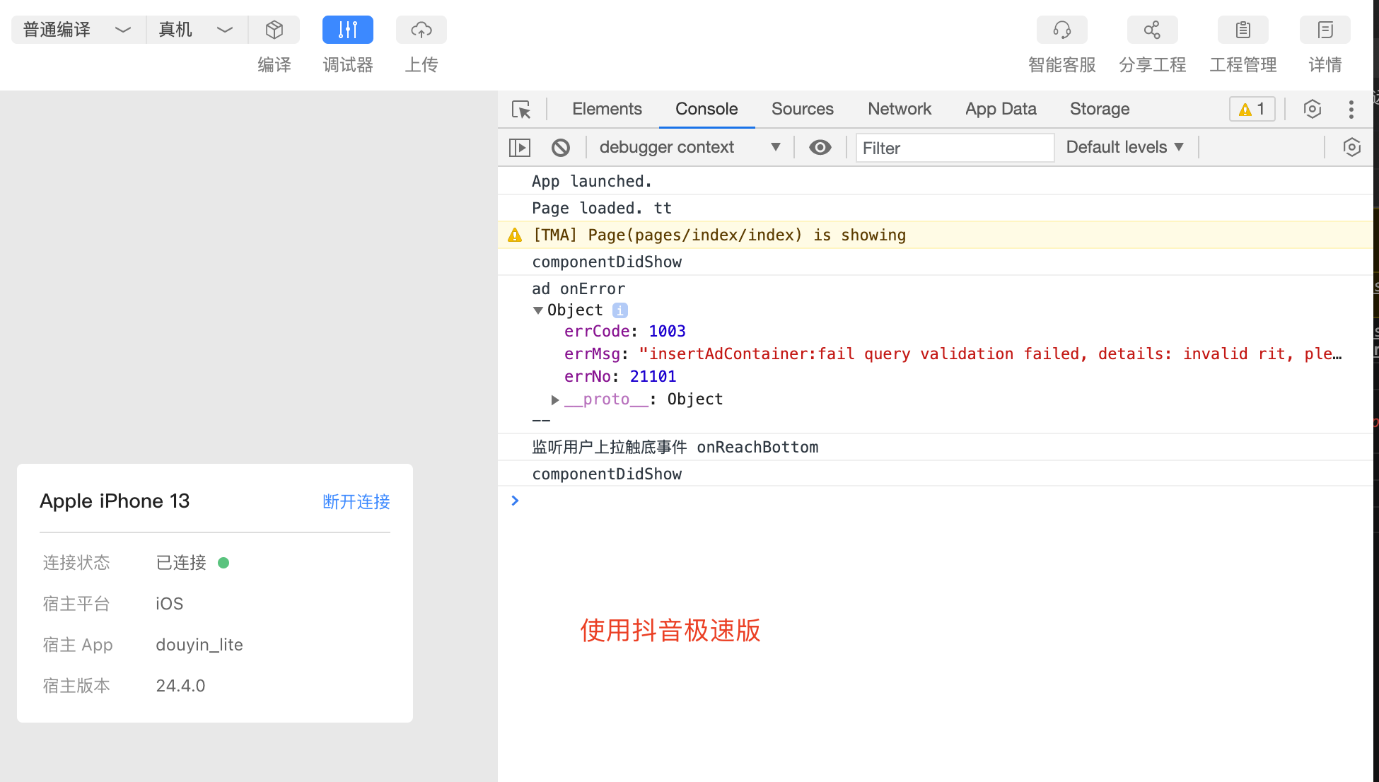 使用ios-iphone13-真机调试模式时,未显示广告模块,错误信息是1002或者1003