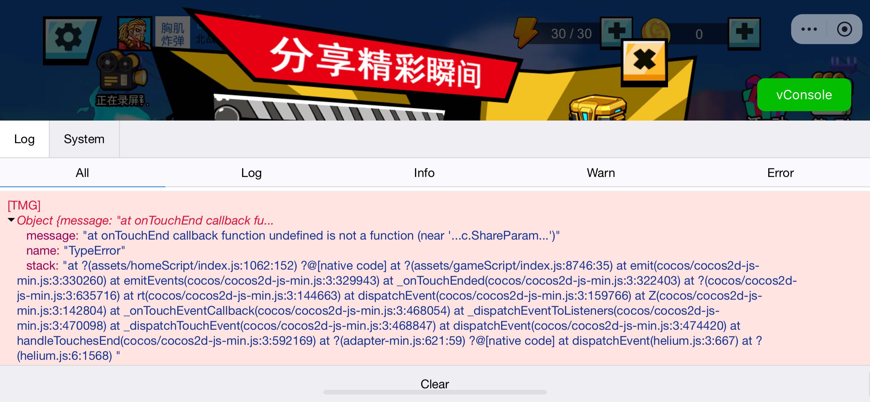 接入抖音小游戏录屏分享发布视频作品的功能时报错,找不到解决的办法,请指导,很急