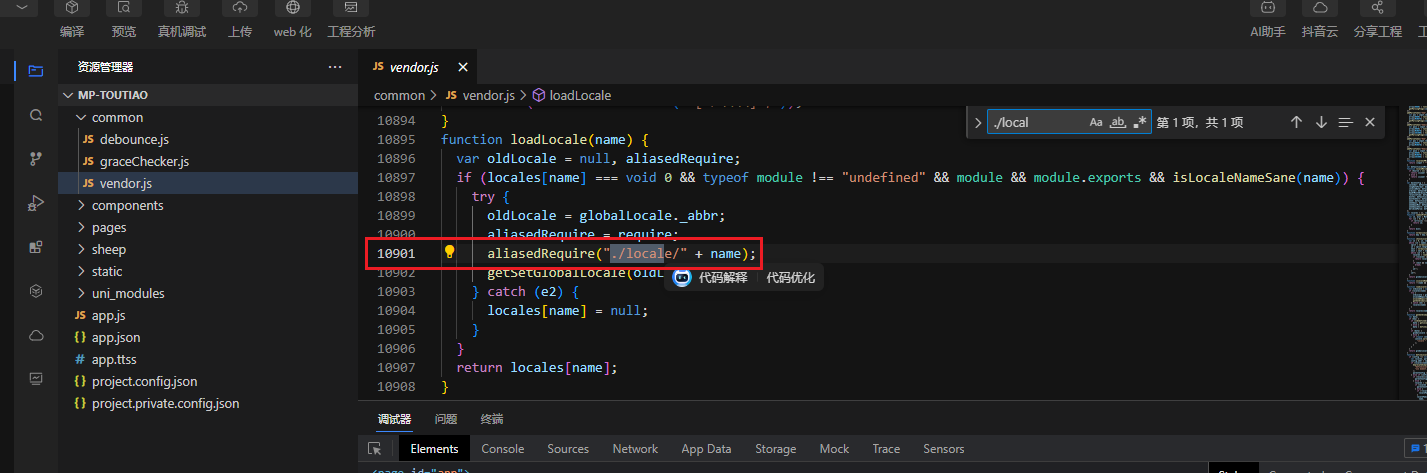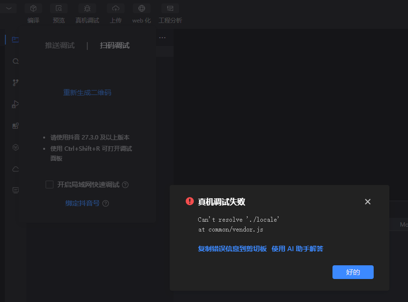 代码编译后,在模拟器上能够正常运行,真机调试的时候无法运行,报错:Can't resolve './locale' at common/vendor.js