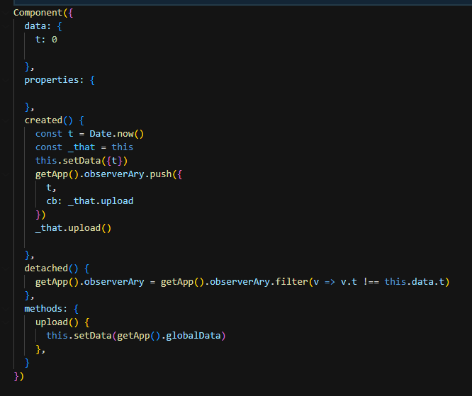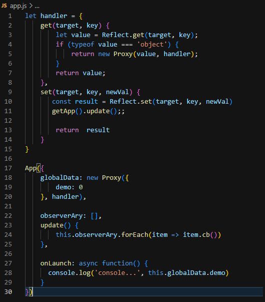 小程序没有好用的全局状态管理方式,不知这种方法可否好用?app.js里面吧globalData用proxy进行代理,注册observerAry数组进行视图更新页面使用数据组件使用数据这样大致是可以实现所有页面数据实时同步