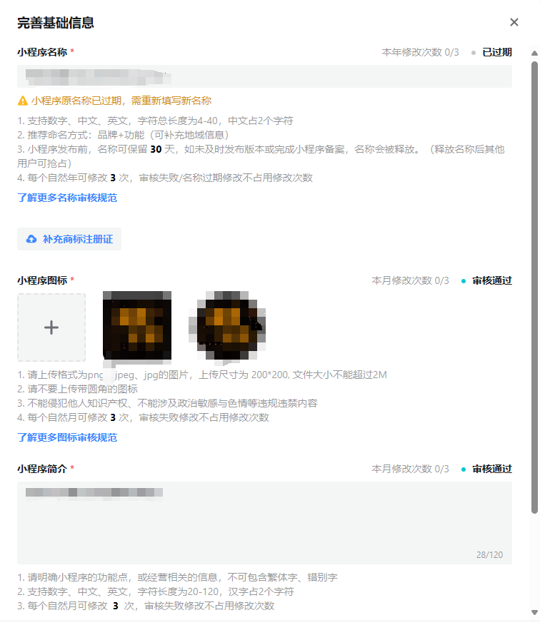 5、创建完以后,进入小程序控制台-对应小程序-设置-基础设置,完善小程序基础信息页面,需要提前准备小程序的图标、简介。审核通过以后就可以完成基础信息的注册了