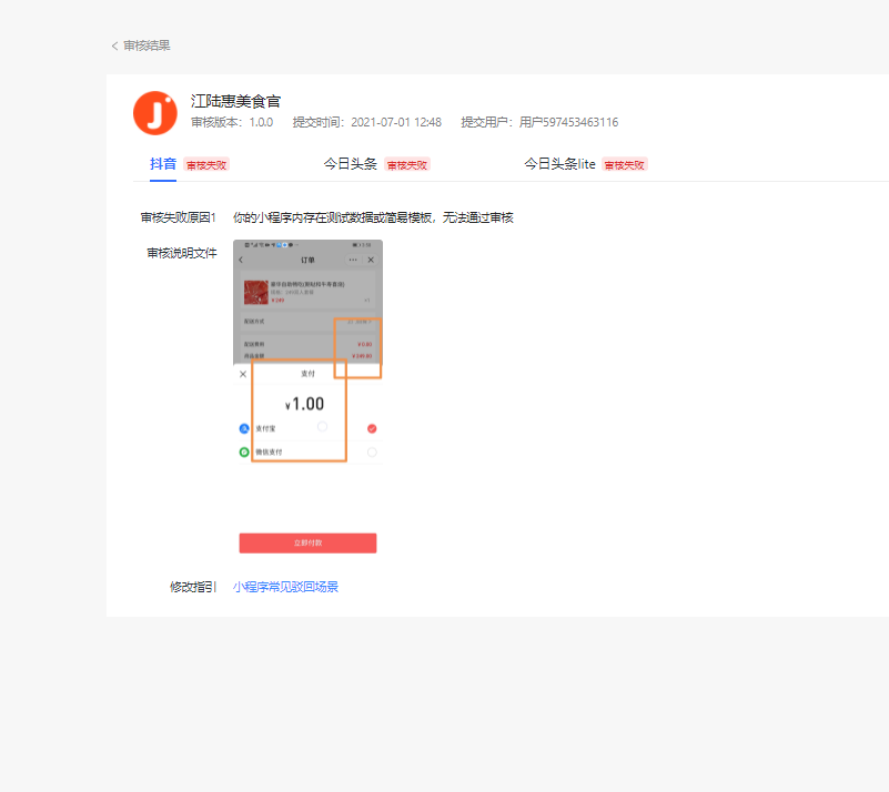 我已经修改过代码,然后体验版也扫码看过,页面都改了,然后审核还是驳回,是不是抖音系统有缓存?我之前是1.0.0,然后我改了以后,还是提交1.0.0。现在我改成1.0.1。不知道为啥体验二维码和你们审核看到的效果不一样