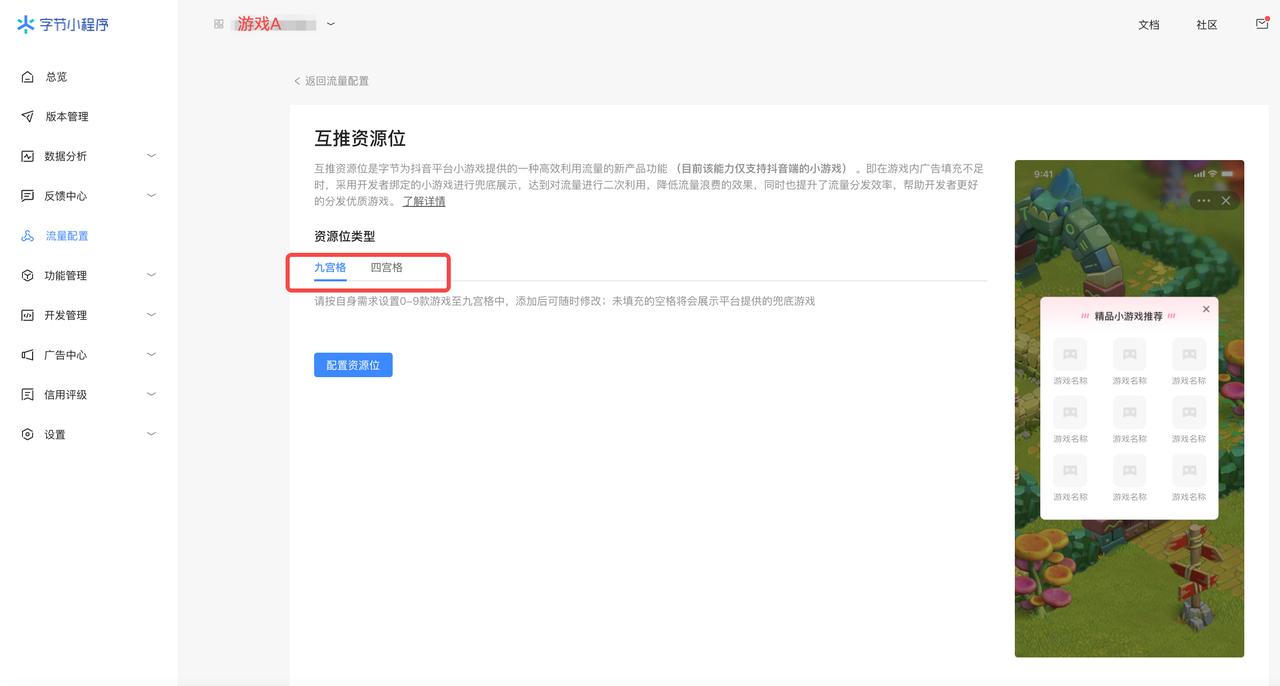 - 在小游戏开平进入【游戏A】的【流量配置-互推资源位】中