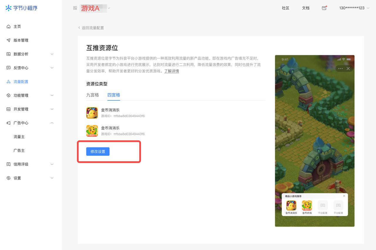 - 修改资源位配置游戏:完成配置后,也能随时进行修改,线上即时生效。