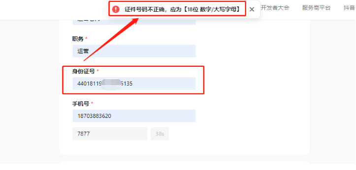注册开放平台后企业认证时,提示证件号码错误/但是填写的是正常身份证号