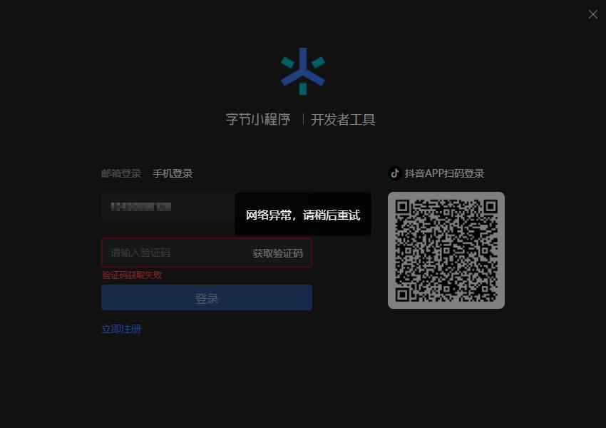字节跳动开发者工具无法登录,显示网络异常,本地并没有开任何代理,访问抖音相关网页全部使用正常,就是开发者工具无法正常使用。