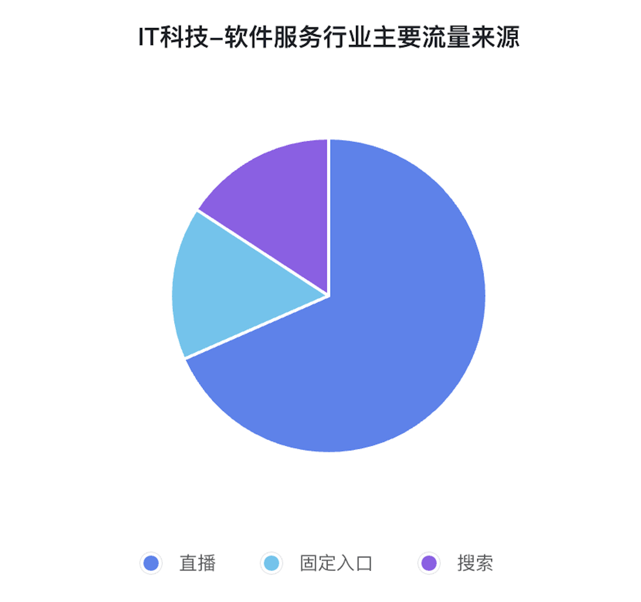 IT科技-软件服务类小程序的主要流量来源是直播、固定入口和搜索。基于优质的抖音账号进行直播自主挂载小程序是小程序冷启动和扩大经营规模的重要手段。直播自主挂载通常可以为软件服务类小程序贡献高达65%的流量,对于有软件服务外包需求的用户来说,搜索能力是小程序获得高精准流量的重要渠道,占比大约为15%;而侧边栏能力(例如主页侧边栏、个人主页侧边栏)价值也不容小觑,其主要作用是提高小程序复访率,可占软件服务类小程序流量的15%。