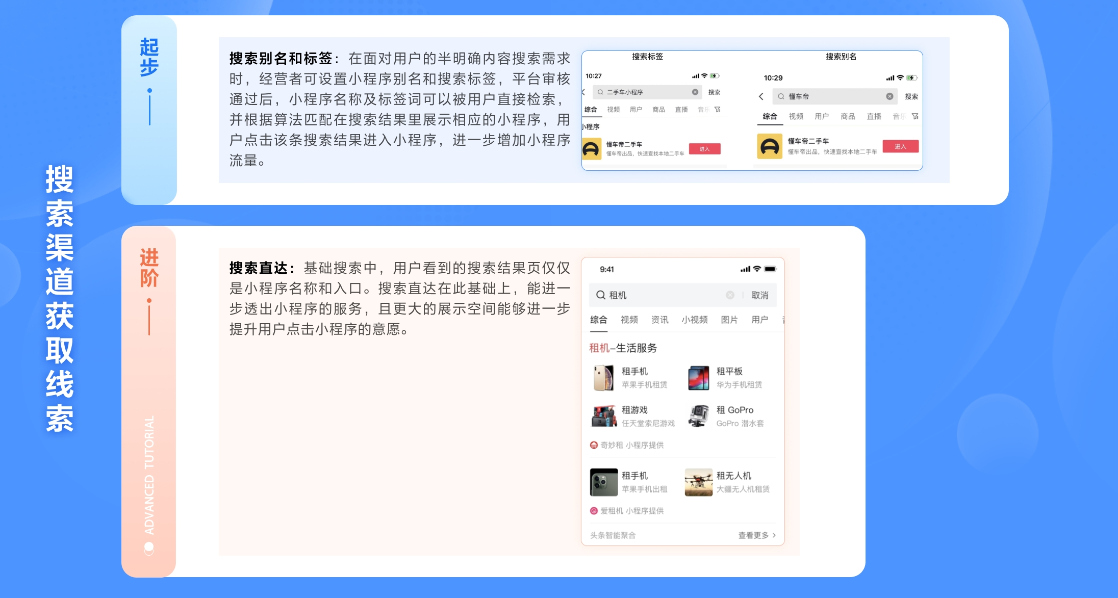 建议重视小程序的搜索配置运营,包括搜索标签和搜索别名运营;侧边栏能力的价值容易被忽略,小程序经营者可以在直播或者短视频场景下加强对侧边栏能力的引导。