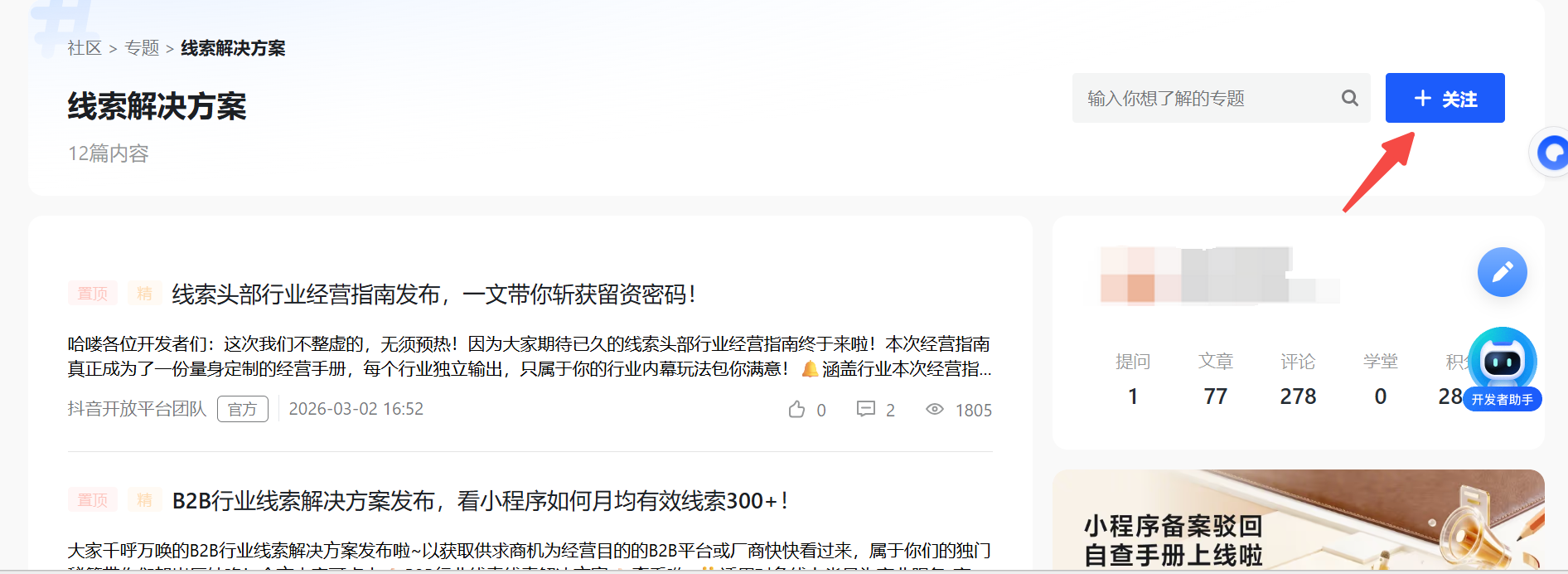 同时,平台已上线线索各个行业定制化解决方案(如房产、汽车、家装、招聘等行业)你可关注社区首页的【专题】-【线索解决方案】板块,进行查看阅读~